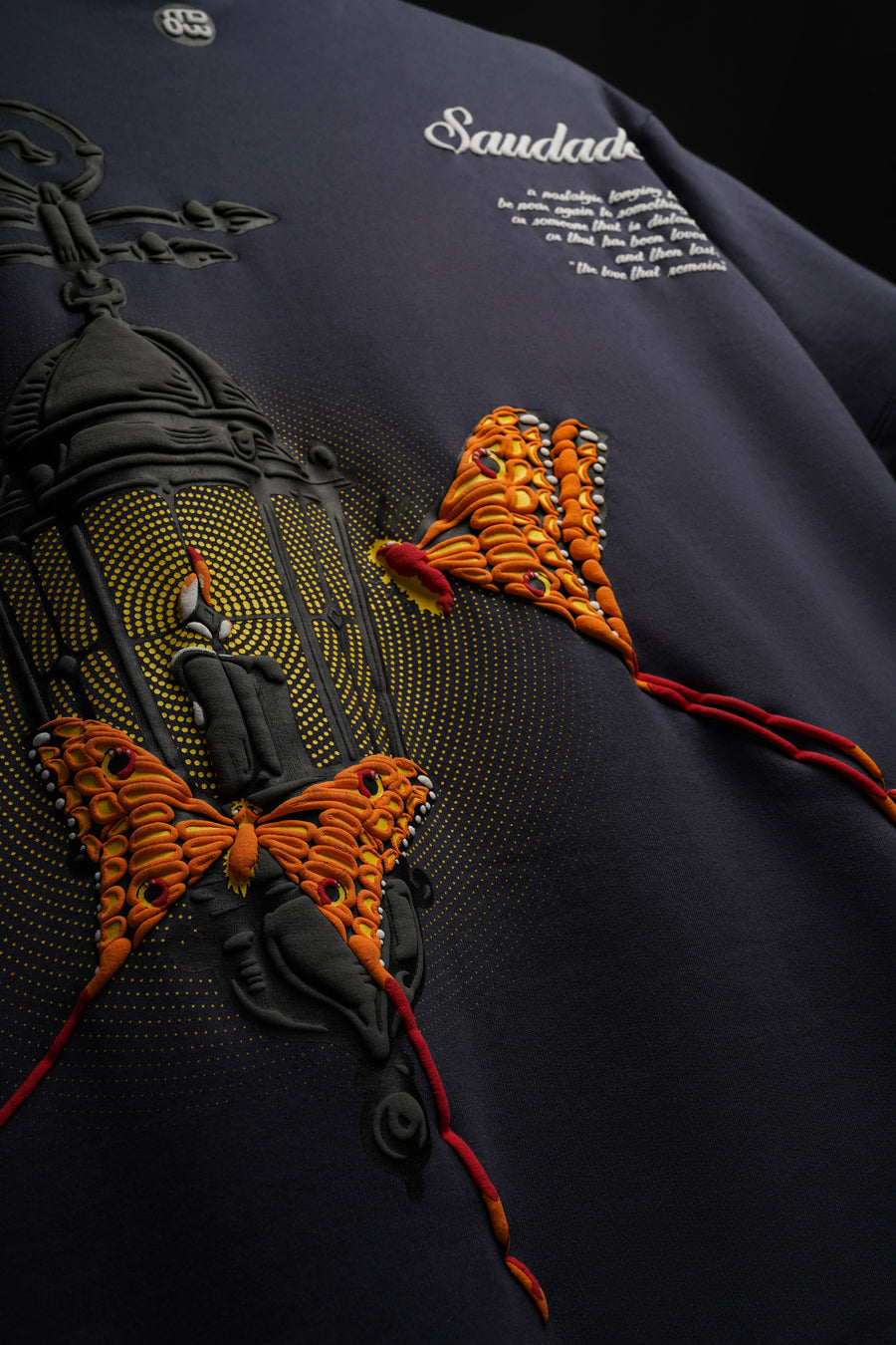UNISEX OVERSIZED TEE IN DARK GREY WITH MOTH & LAMP DESIGN ON BACK INCLUDED SCREEN & PUFF PRINTING IN FRONT & BACK. IT ALSO INCLUDES BIO-ENZYME & ANTI-BACTERIAL WASH.