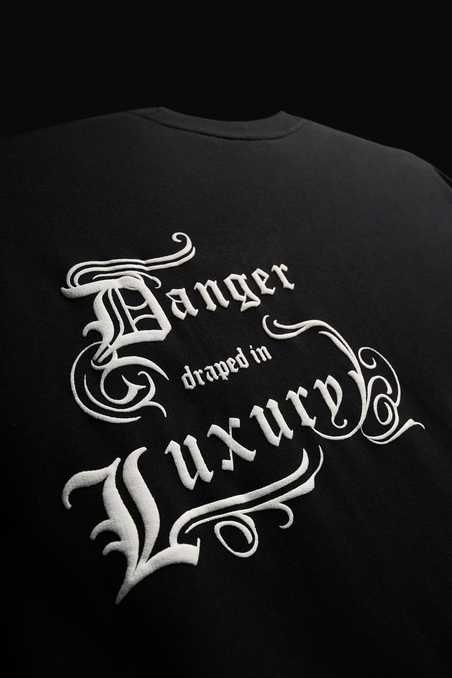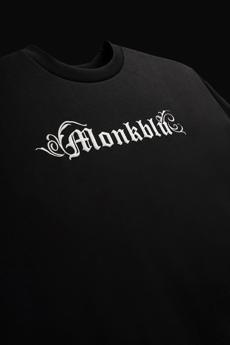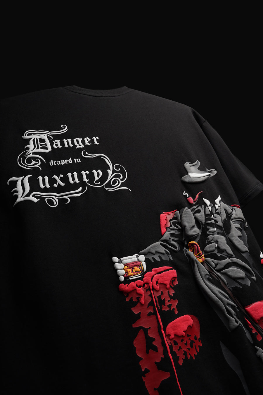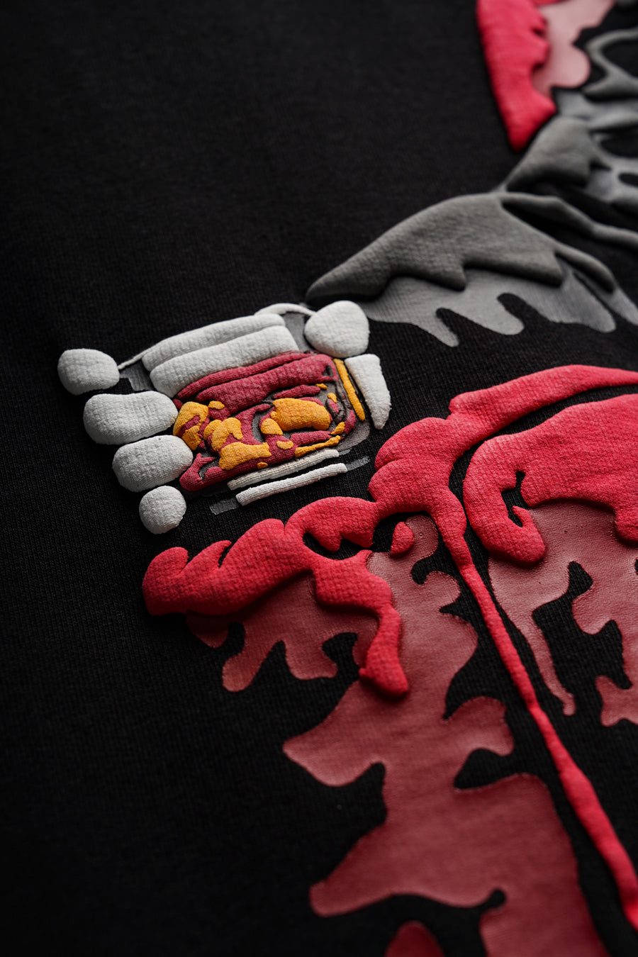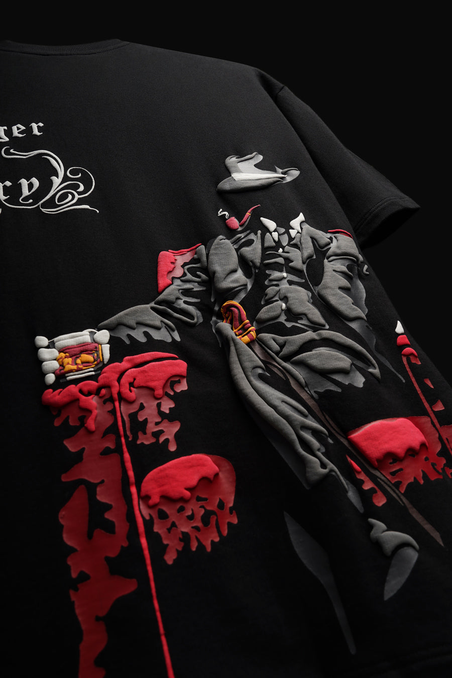 UNISEX OVERSIZED TEE IN BLACK WITH SINISTER DESIGN ON BACK INCLUDED SCREEN & PUFF PRINTING IN FRONT & BACK. IT ALSO INCLUDES BIO-ENZYME & ANTI-BACTERIAL WASH.