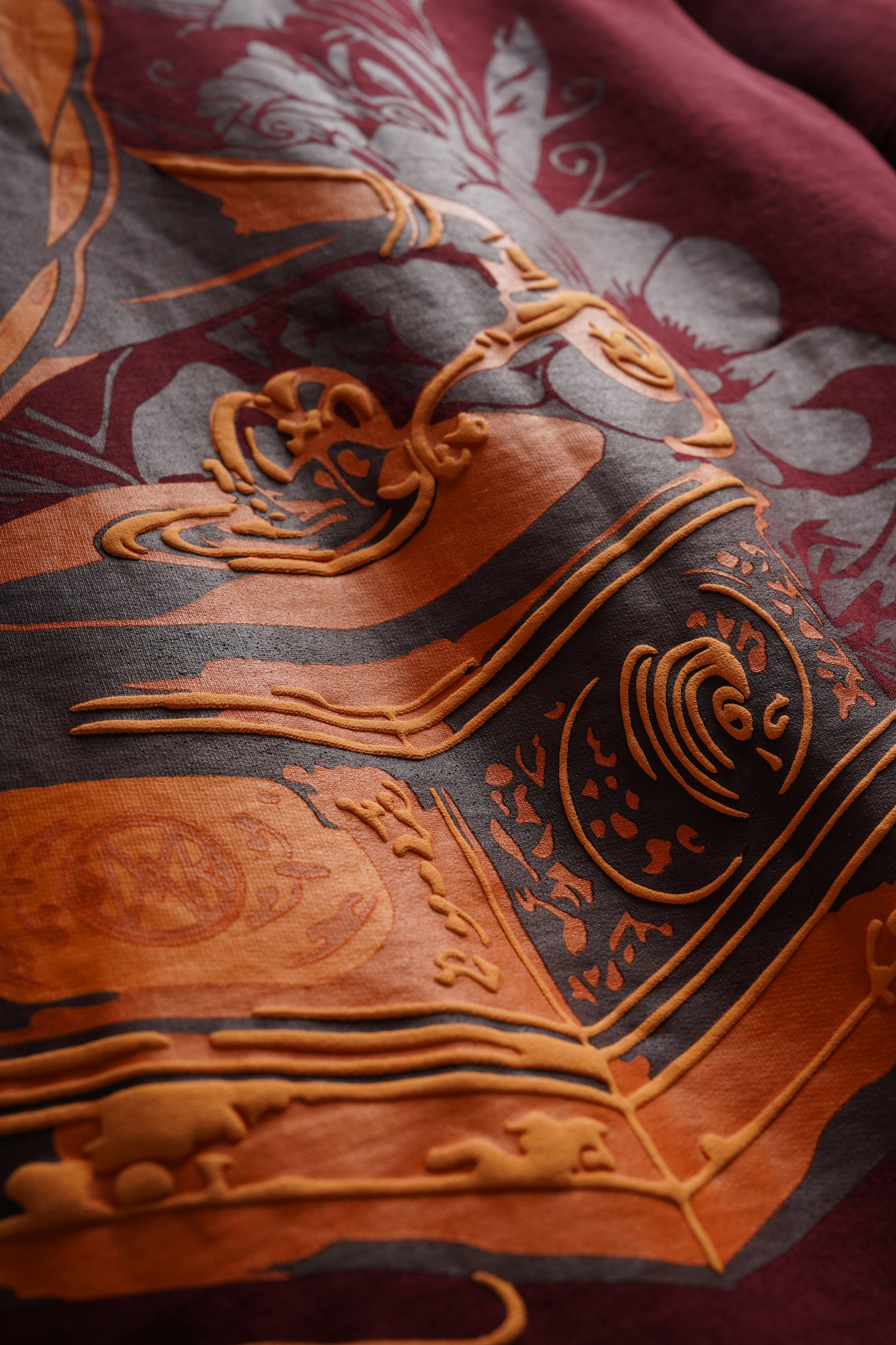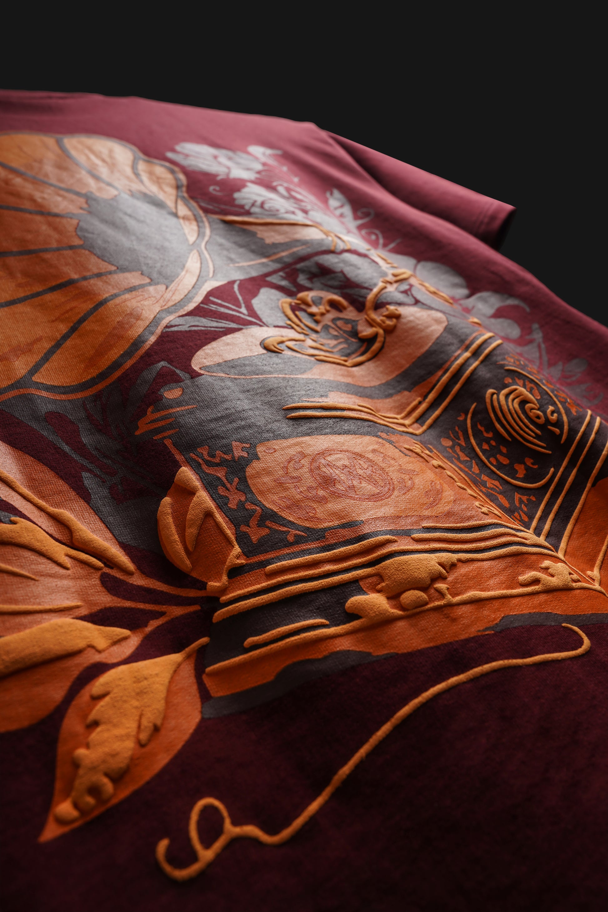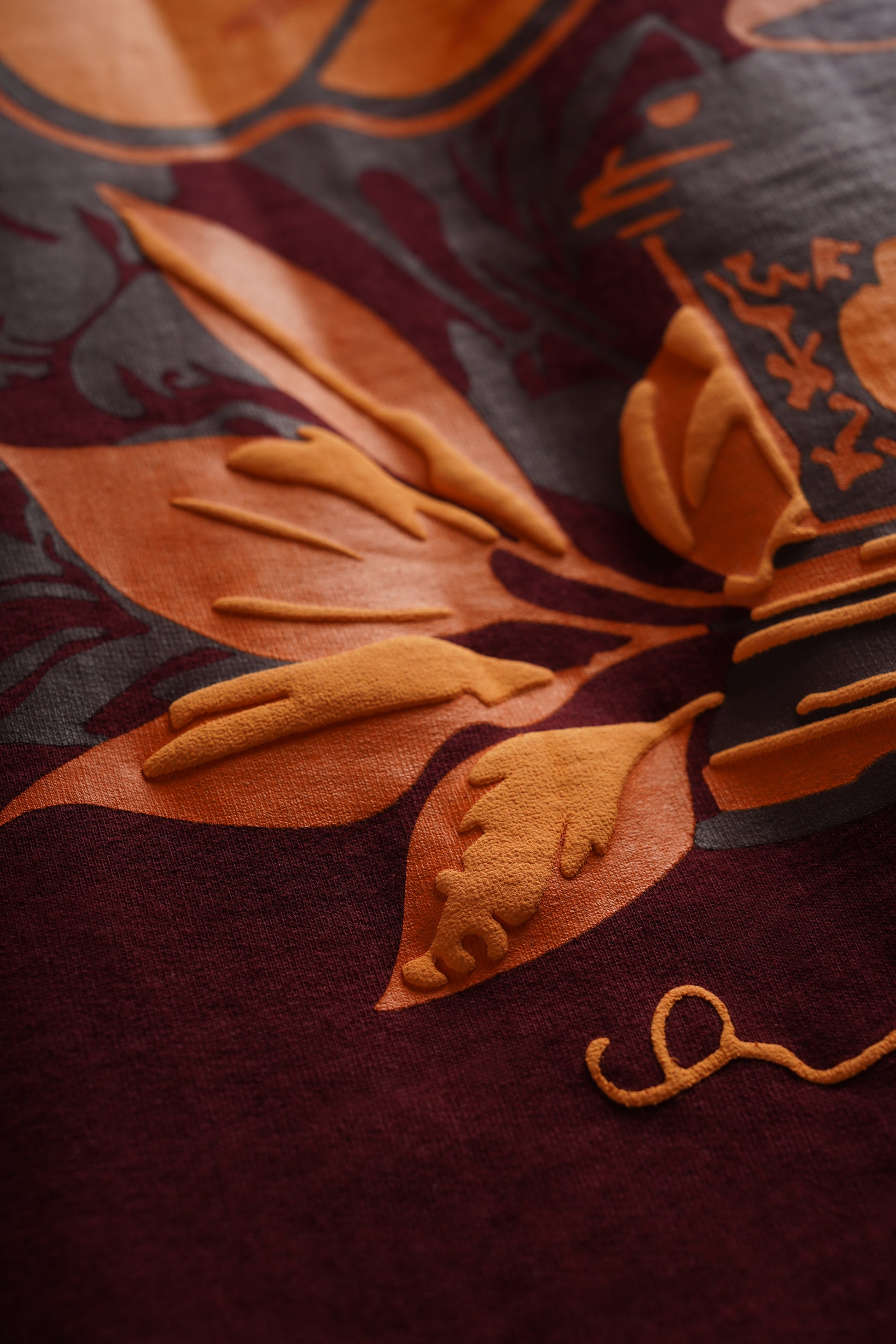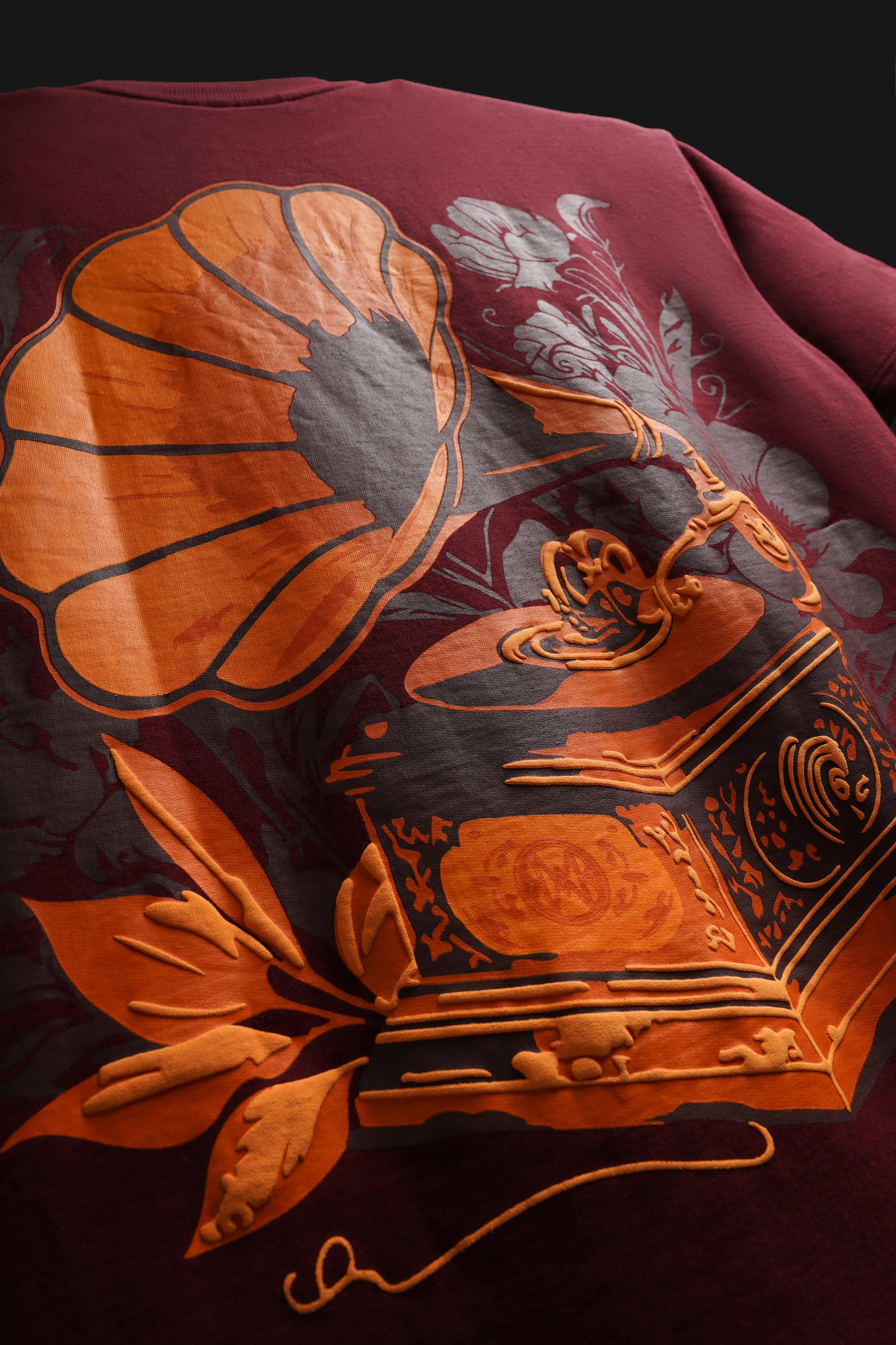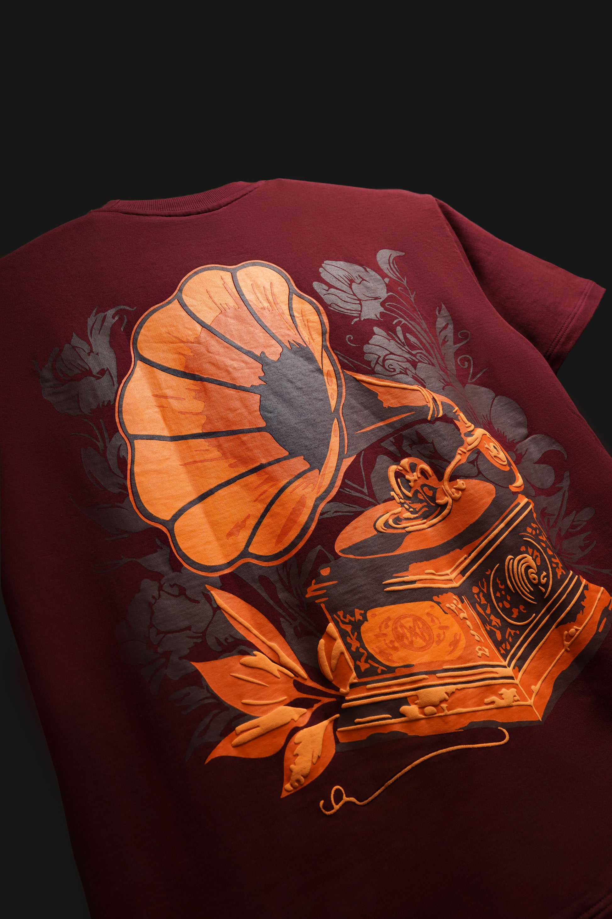 UNISEX OVERSIZED TEE IN MAROON WITH GRAMOPHONE DESIGN ON BACK INCLUDED SCREEN & PUFF PRINTING IN FRONT & BACK. IT ALSO INCLUDES BIO-ENZYME & ANTI-BACTERIAL WASH.