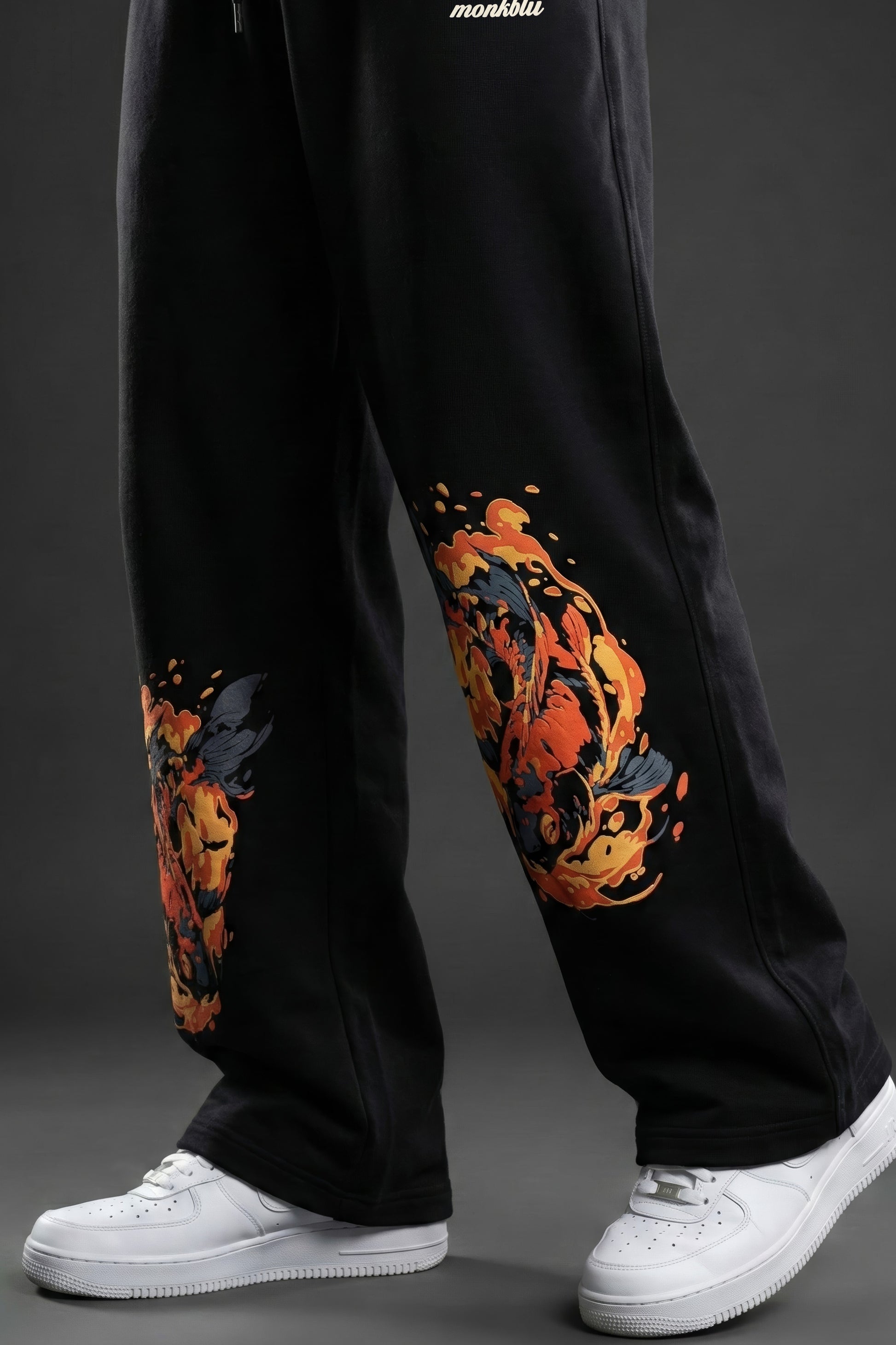 A PREMIUM STRAIGHT FIT PANTS IN BLACK WITH TWIN FISH DESIGN ON FRONT WITH SCREEN AND PUFF PRINT DETAILS ON FRONT. TREATED WITH A BIO-ENZYME AND ANTI-BACTERIAL WASH FOR ENHANCED SOFTNESS, FRESHNESS, AND LONG-LASTING COMFORT.