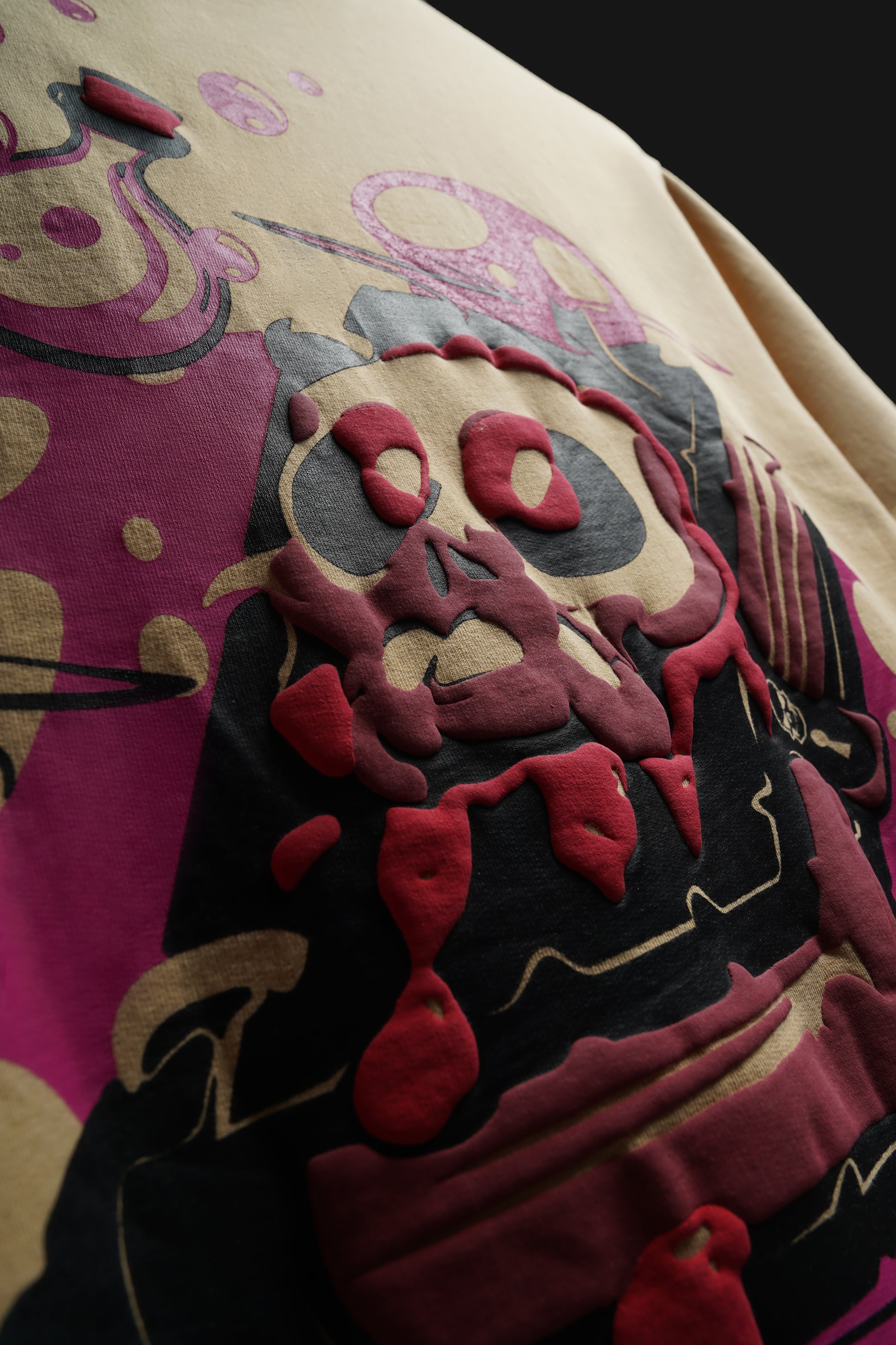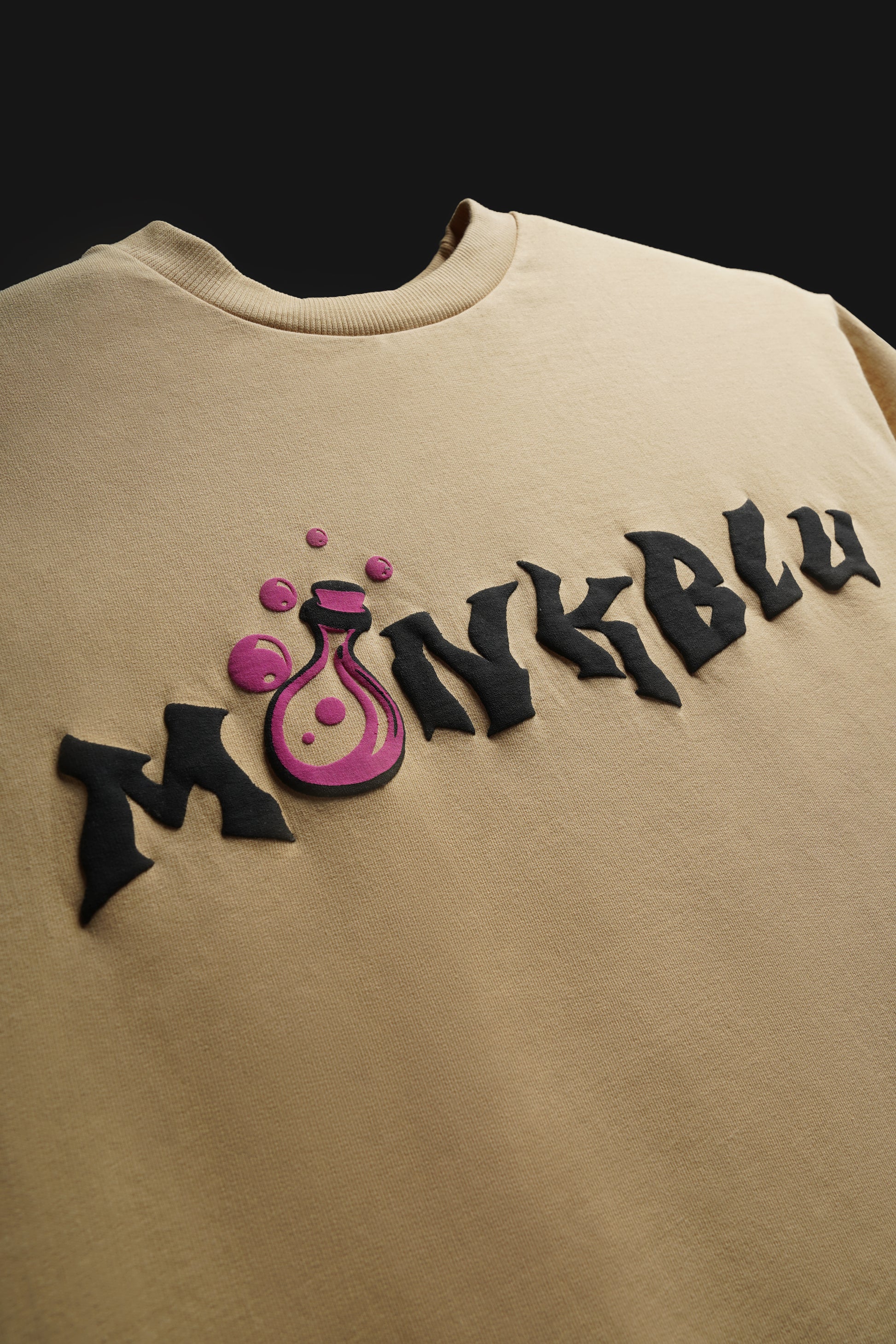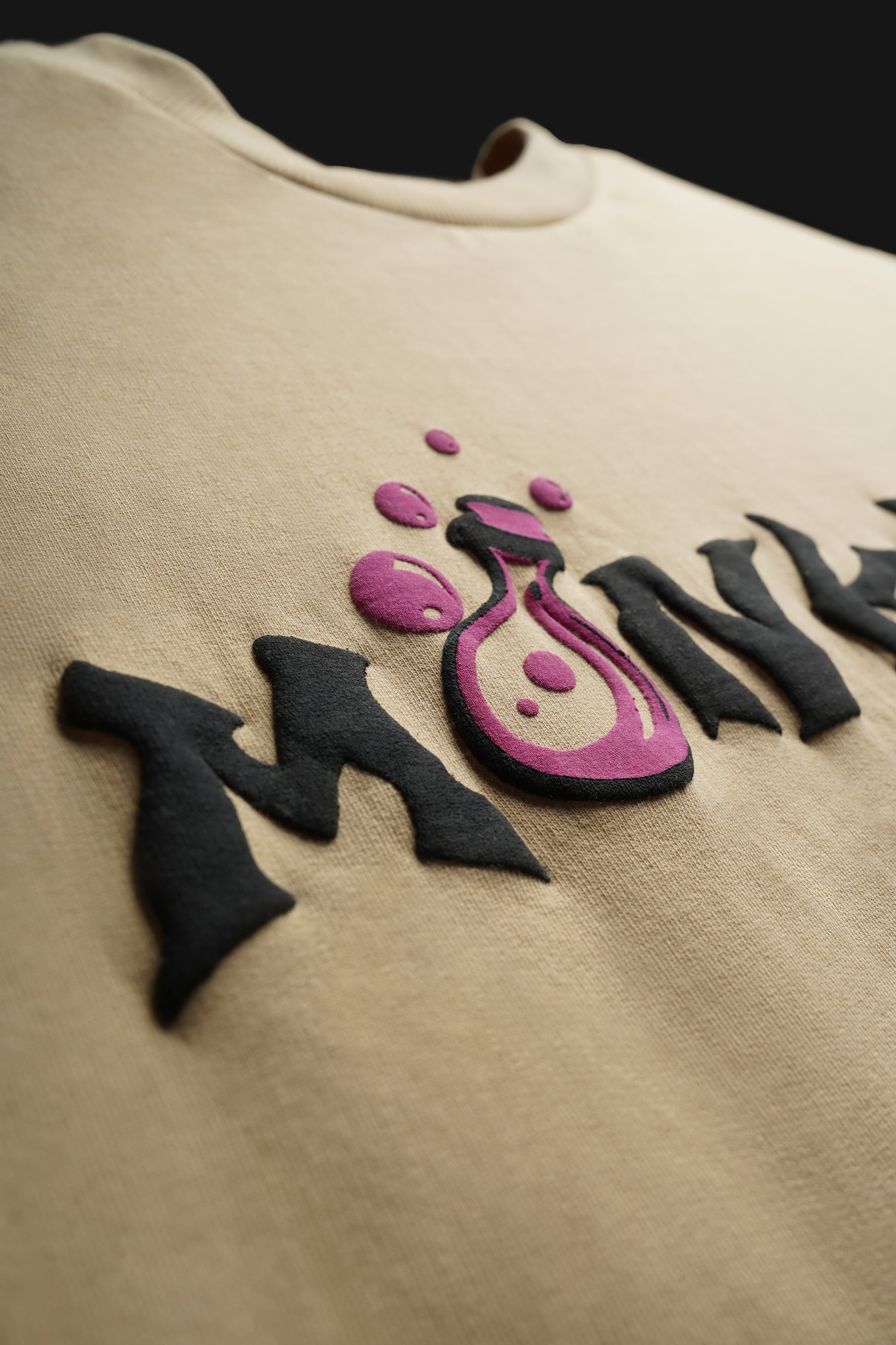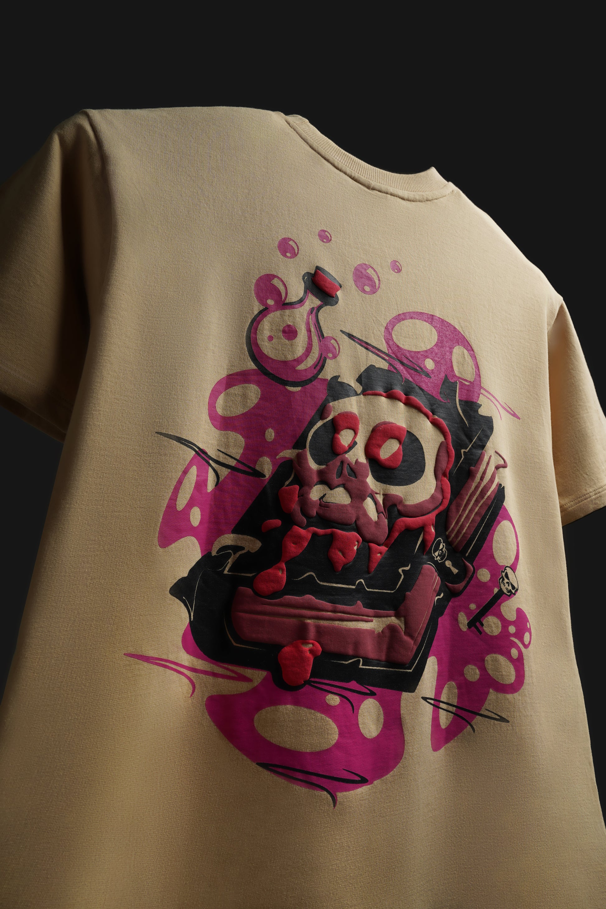 UNISEX OVERSIZED TEE IN BEIGE WITH MAGIC SPELLBOOK DESIGN ON BACK INCLUDED SCREEN & PUFF PRINTING IN FRONT & BACK. IT ALSO INCLUDES BIO-ENZYME & ANTI-BACTERIAL WASH.